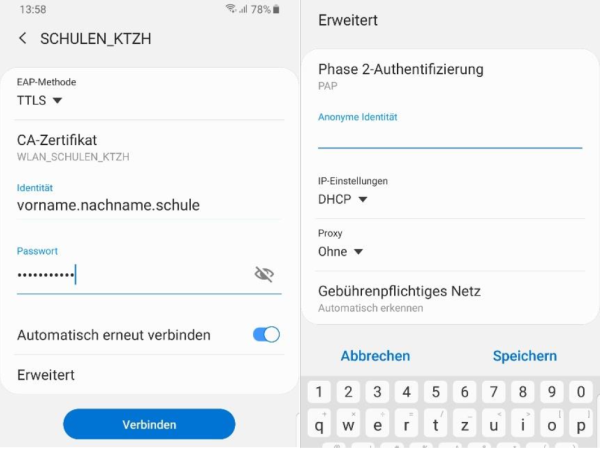 - Zertifikat: keine oder WLAN_SCHULEN_KTZH